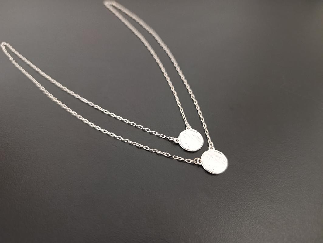 Design: escapulário medalhinhas redondas, sendo uma com a imagem da Nossa Senhora e a outra com imagem Sagrado Coração de Jesus